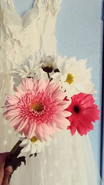 the beginning stages of a bridesmaid’s bouquet with my Grandma’s wedding dress from the 60s in the background!