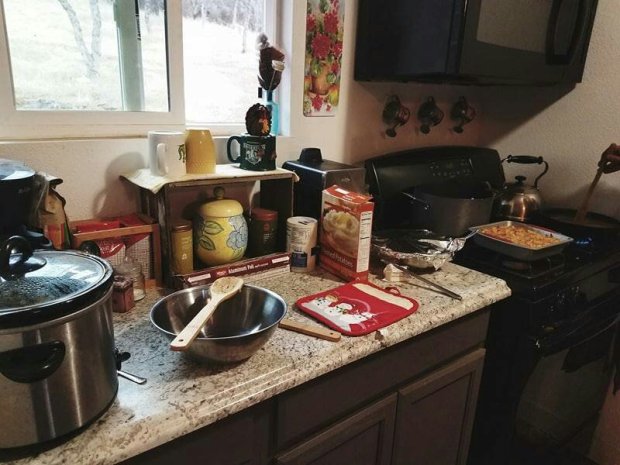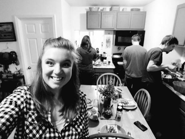 How many people can you fit in a small kitchen? FOUR! Turns out you can fit 4…..and rather uncomfortably at that! Cooking mashed potatoes, carving turkey, finishing the green bean casserole and making up the gravy was….interesting. Can you spell C-R-A-M-P-E-D!? It was quite fun, though.