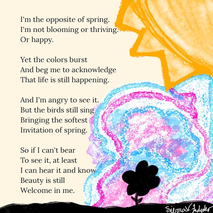 I am passionate about helping people relate to their pain in a way that heals. This means framing the sharp edges of heartache with beauty and light. It is important to be brutally honest both about pain and about hope. The more I write, the more I understand that we all want to see our pain on paper, because we all want to be seen. But we also want to see it gently and we want to be reminded of hope, joy, and healing. So, I’ve written a small poetry collection (which I’ll add to over time) all about spring.