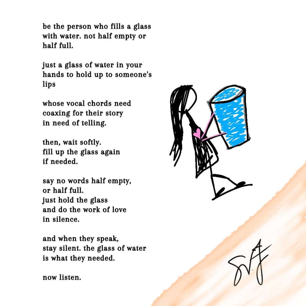 No words half empty or half full. Just a glass of water with your presence.