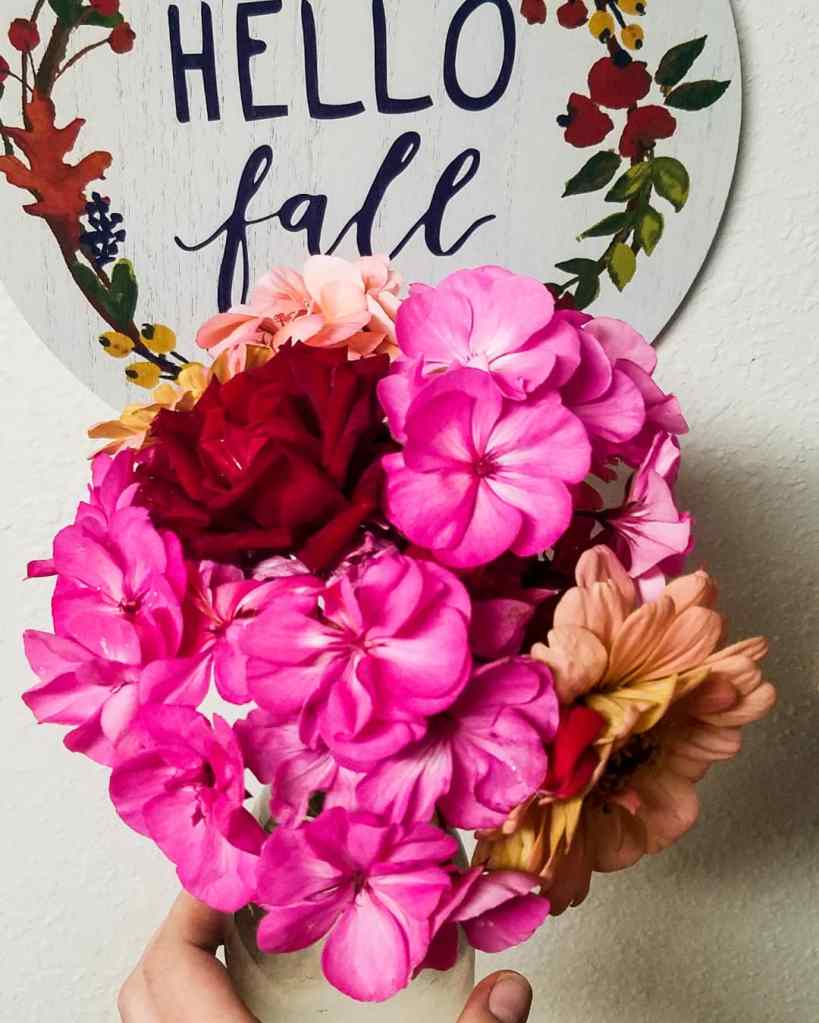 That single October vase of flowers felt like my only true harvest of the year. Still we did have beautiful May roses, scrawny, scraggly sunflowers, and one Mother’s Day geranium (out of the 3) thrive. All while our son’s flower came back to life, a once pitiful flower bed filled with bright pink blooms, and our mums grew back in after getting their tops and leaves eaten!
