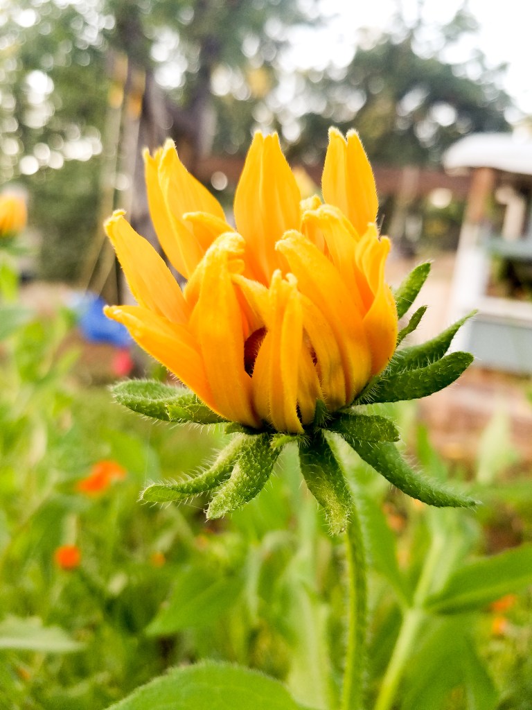 Since I’m no flower expert, I’ve learned to let thing go and grow. I’ve pulled some things much too soon, and I’ve been surprised by the best things too many times to swipe through my flowerbeds pulling at “weeds.” Was I tempted to pull up these leafy greens things? Yes. I even pulled out at least one to make room for zinnias because I had seen nothing come of this tall, leafy green thing and had no idea if anything would. It just kept getting bigger and taller and wider and had been growing since this March! Where was the “real” progress! Where was the flowering part?! Nowhere, that’s where. When do I pull this thing?!