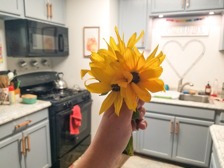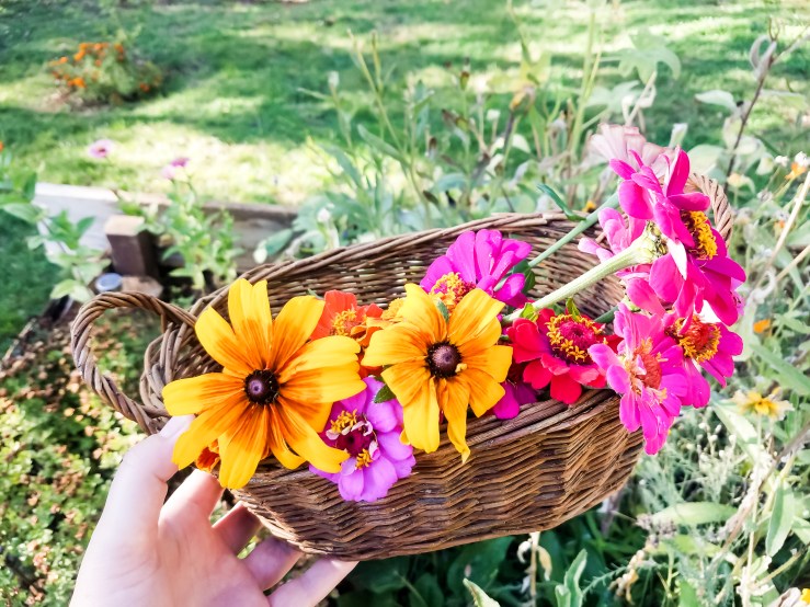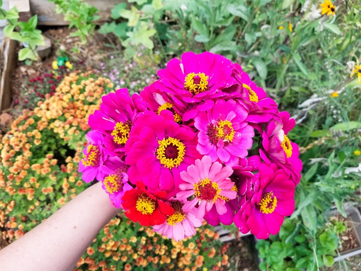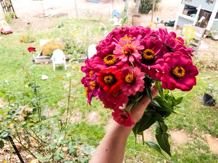 It was always the picking up of discarded fruit pouches, forgotten cheese, left water bottle, or ballooned crackers. The October garden was the height of everything good in this thick season of motherhood. The zinnias burst to life for the height of their glory and my son’s flower erupted in bloom, and my red rose took off into the sky.