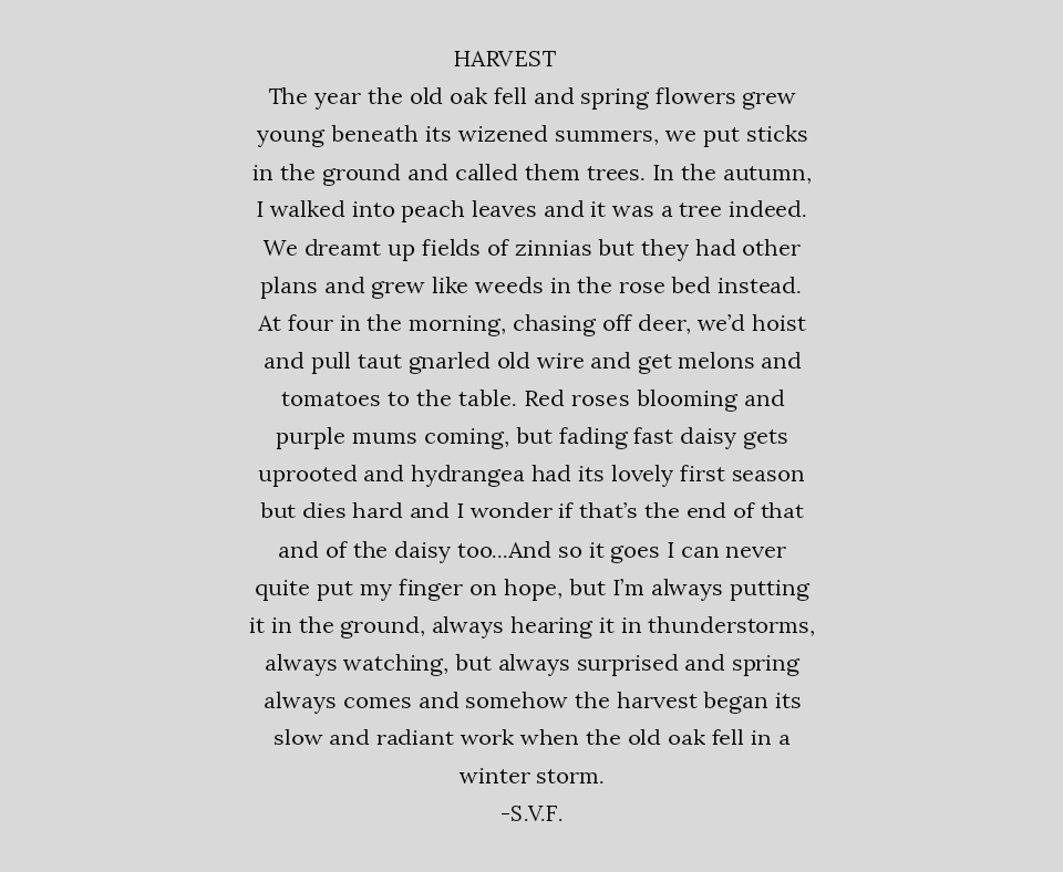 In late winter, I heard the formidable crash of a huge oak tree on the hillside next to our home. Death for the old oak wasn’t the end and I write more of those thoughts here. It’s a stunning prelude to spring, but below I’ve posted the poem I wrote this autumn as I thought back on this year of seasons.