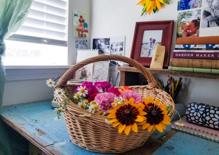 I’m Mom in the garden, taking pictures of flowers, gushing over what’s in bloom, sitting in a worn chair by warm garden stones, and coming back in with sunflowers in hand.