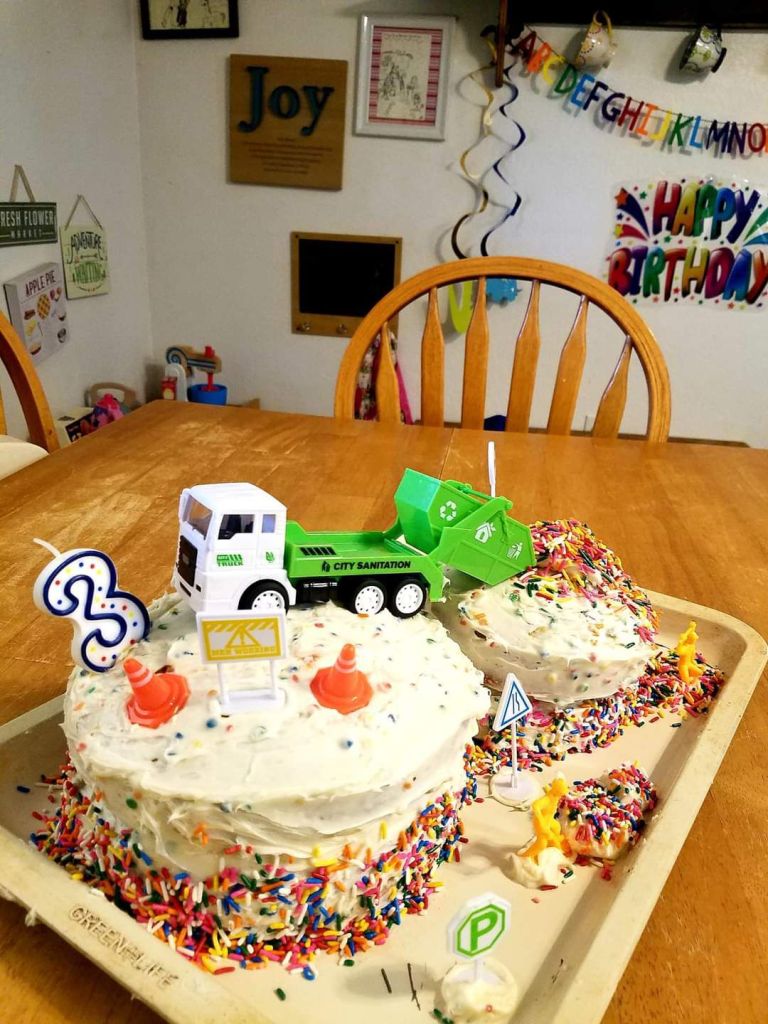 For my son I had even more fun doing it! By this time I had a few successful cakes come out of my kitchen! I stuck with classic confetti cake for my son’s birthday and turned it into a construction site filled to overflowing with sprinkles!