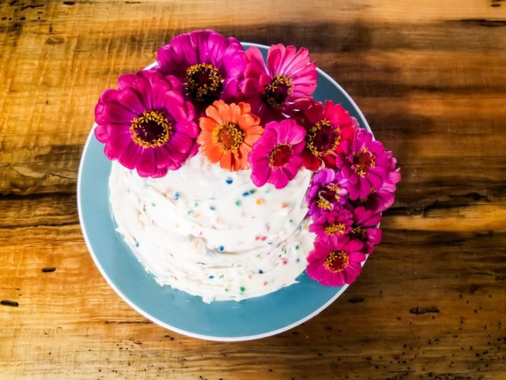 In the fall, I made Harvest Cake which simply meant I used a leftover strawberry box cake from the pantry, covered it with confetti icing, and then decorated it with a harvest of zinnia flowers from the garden.