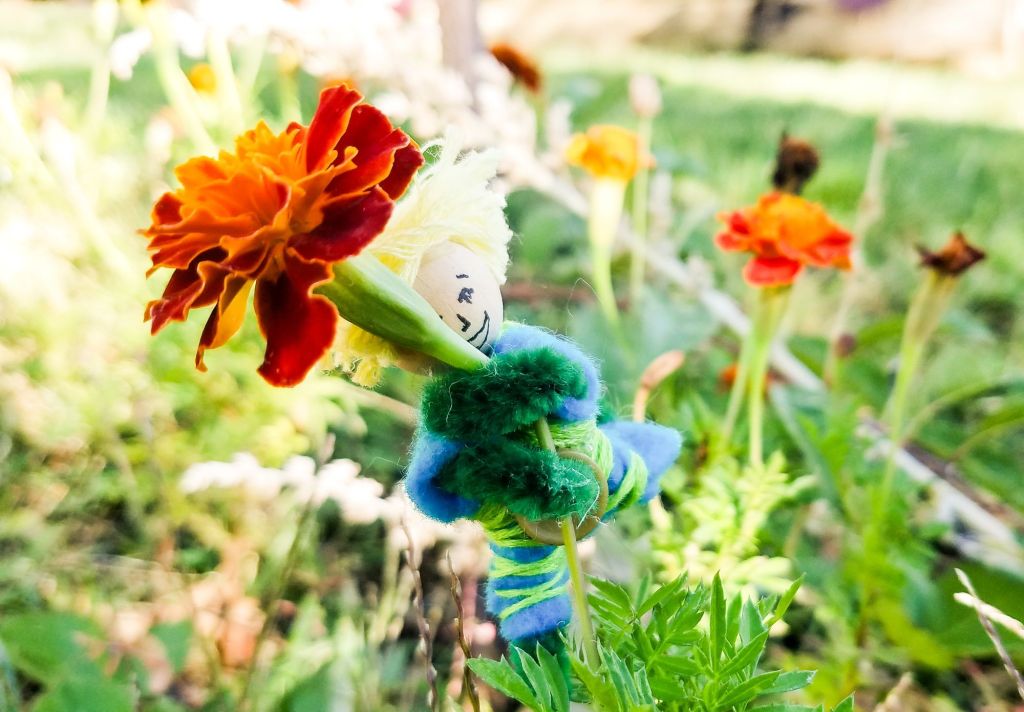 The eldest of the fairy family spent her time in the Mum Forest. Although there were some red and white blooms, she chose to make a bouquet of only the orange. I caught her eye just briefly, welcomed her to the garden, and left some tiny striped string in a pocket of the garden so she could tie her bouquet of mums with a bow.