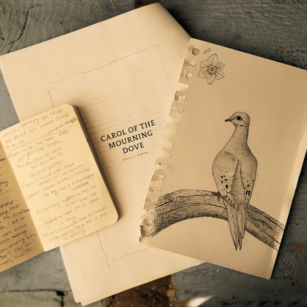 The Mourning Dove sketch is done by my husband and in real life that beautiful bird looks alive! So excited to incorporate my husband’s art into this new poetry book, Carol of the Mourning Dove.