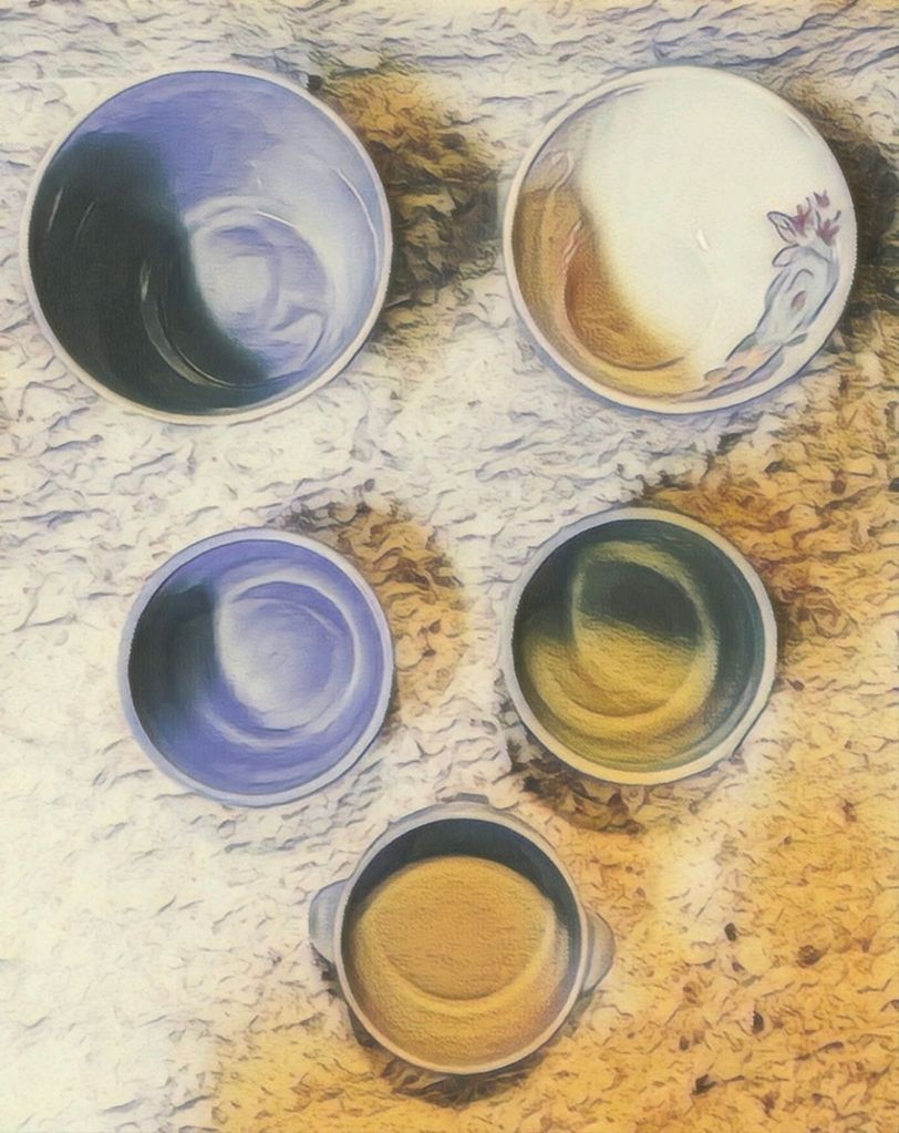 Five old bowls on the kitchen counter, Dad gets home from work, hello! Dishes in the sink again, and goldfish on the floor.
