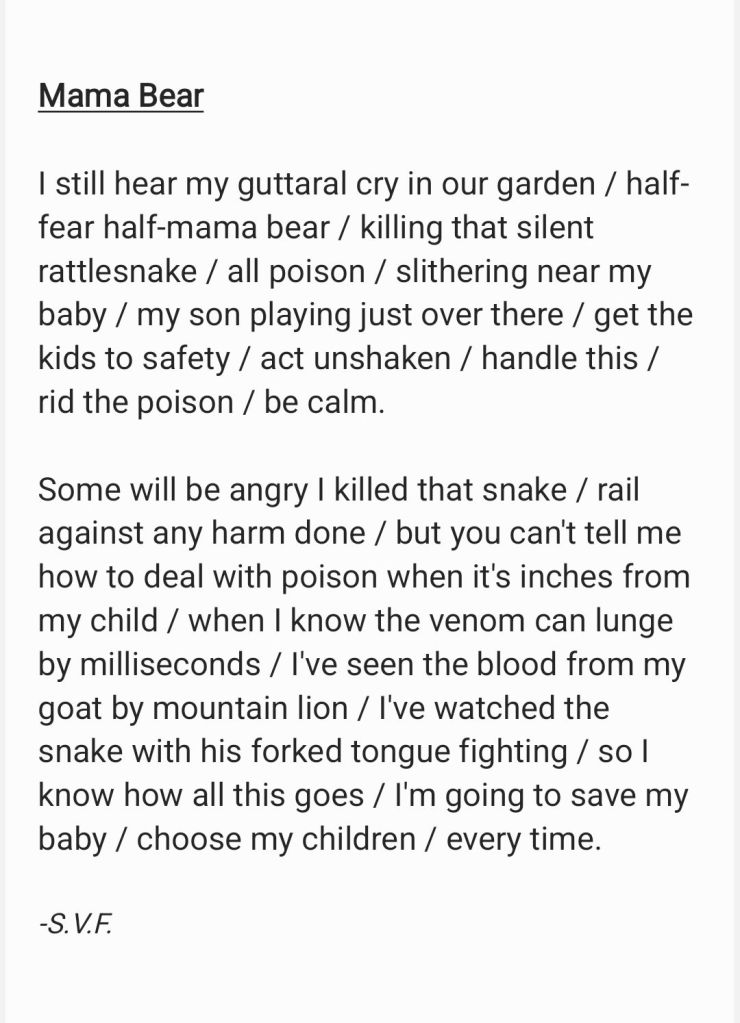 A few years ago now, I noticed a rattlesnake slithering mere inches from my crawling daughter, and I’ve written about it in the following poem. The poem expresses the “mama bear” side of motherhood rather than the “wildflower” side.